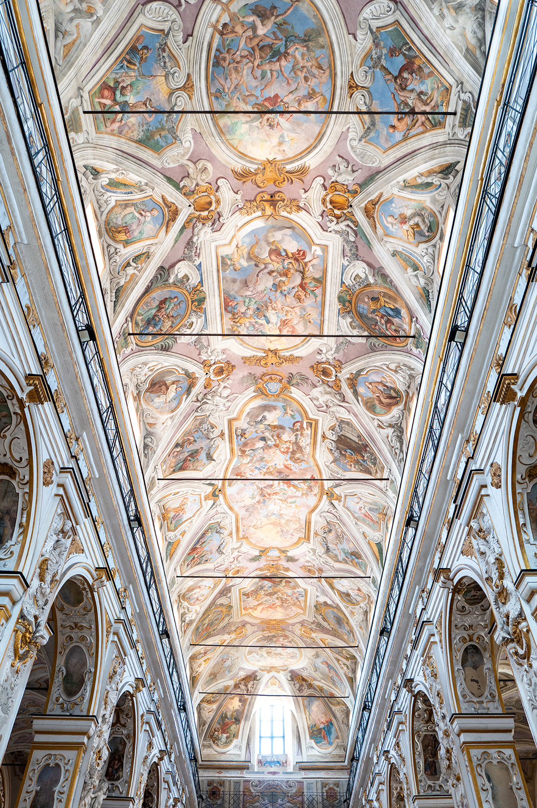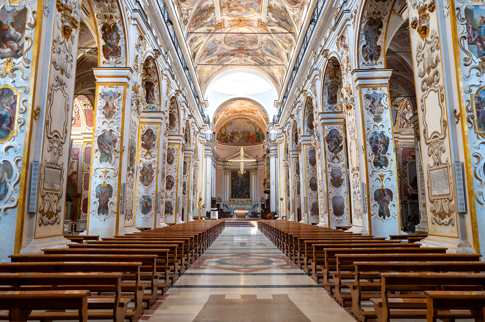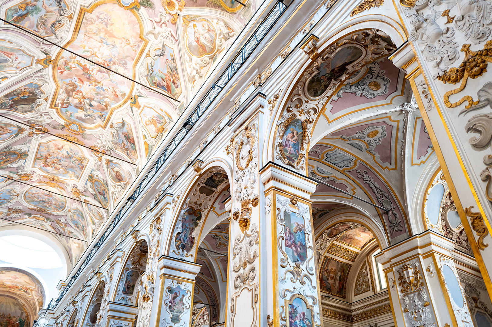 Tra il 1718 e il 1720 il fiammingo Guglielmo Borremans trasformò la navata centrale in una scenografia celeste: trompe-l’œil, quinte architettoniche e un profluvio di angeli incorniciano l’Immacolata Concezione dipinta sull’altare maggiore, mentre lungo la volta sfilano patriarchi e profeti che accompagnano il fedele nell’ascesa dello sguardo.