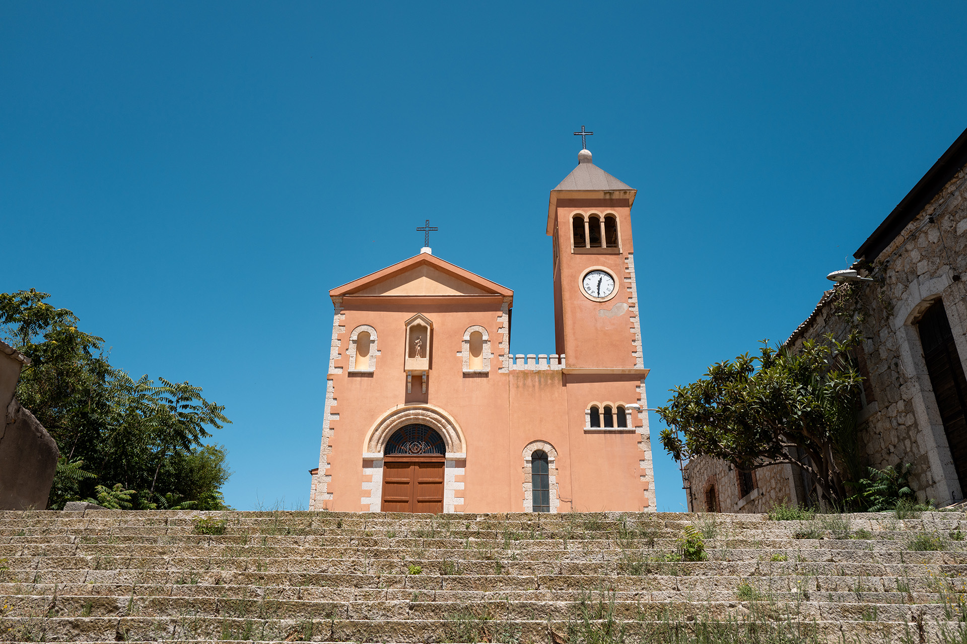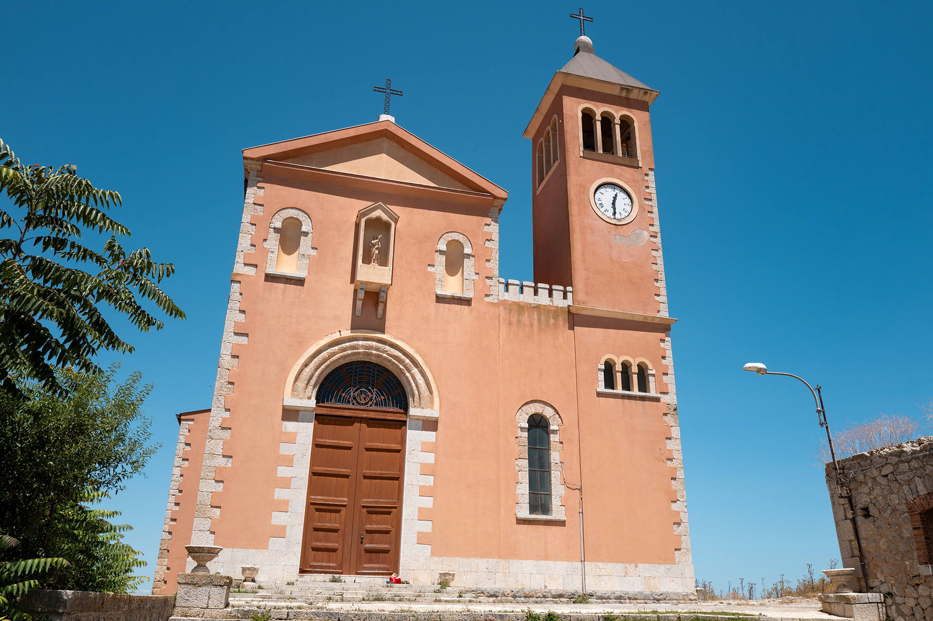 La chiesa, intitolata a Santa Rita da Cascia, domina, con prospetto tinteggiato di rosa e un campanile aguzzo alto 25 metri, la scalinata che conduce al piccolo villaggio agricolo, incastonata tra il monte Pisciacane e le colline circostanti.