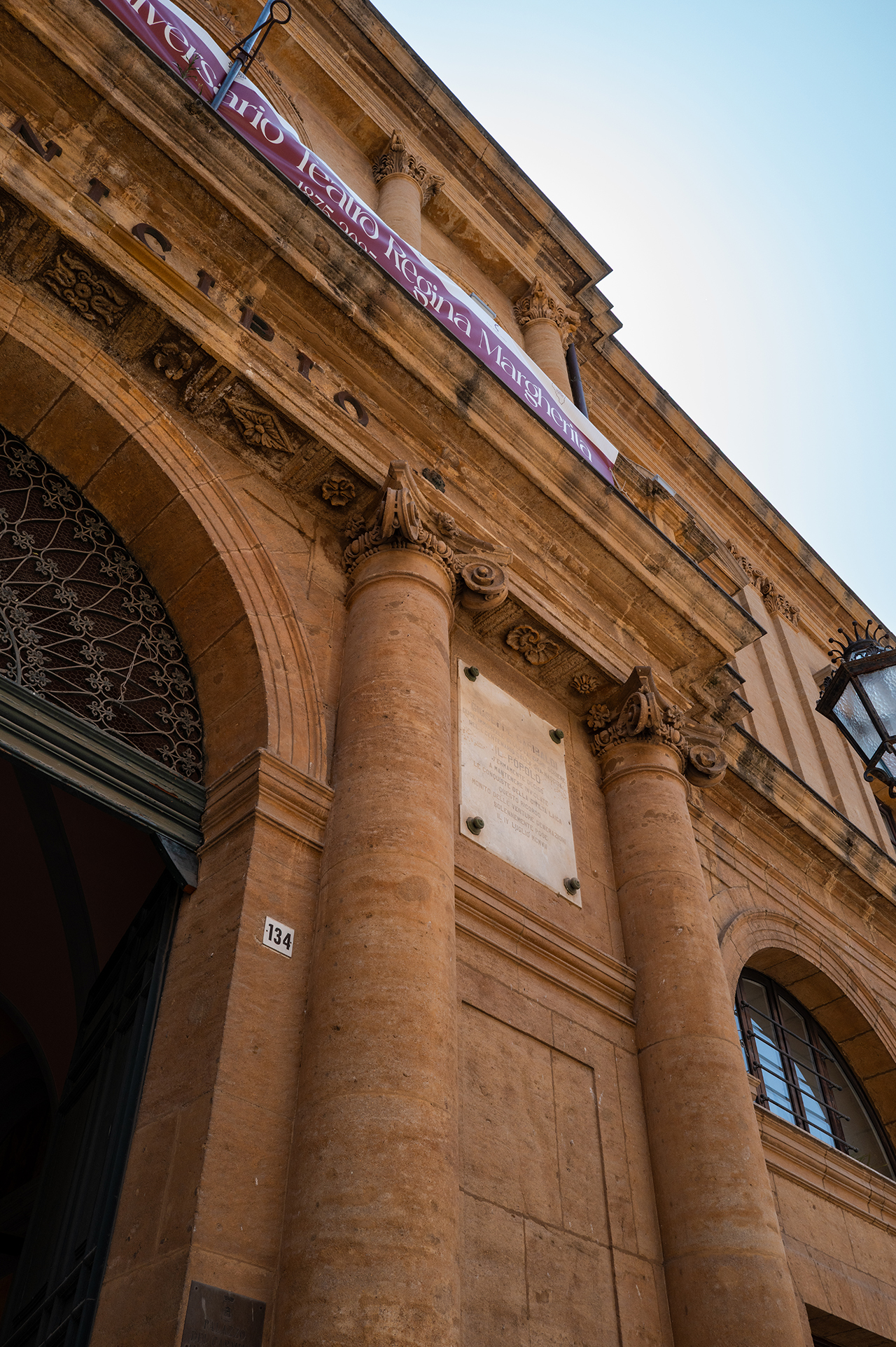Nel corso dei secoli, il prospetto ha subito continue trasformazioni, inglobando pezzi dell’antica muratura conventuale e aggiungendo elementi neoclassici e tardo barocchi, fino a configurarsi come il grande edificio giallo in Piazza Garibaldi che dialoga con la Cattedrale e la chiesa di San Sebastiano.