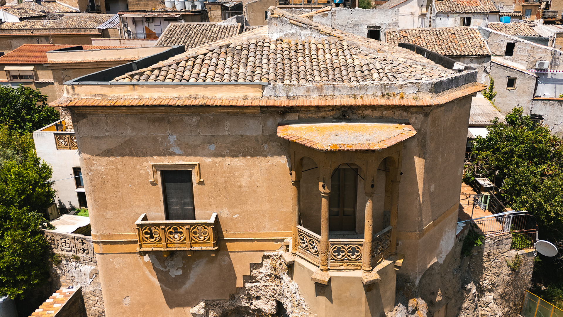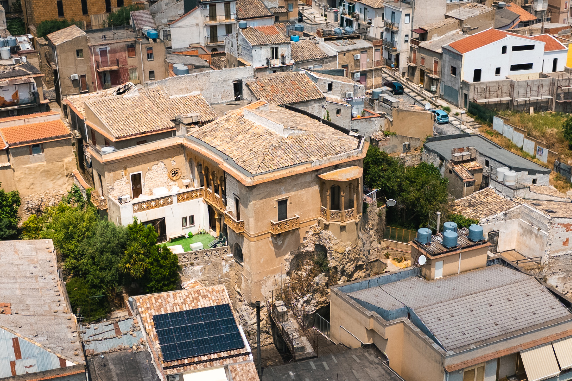 Articolato in origine da due corpi, ne sopravvive solo quello superiore; l’altro, invece, negli anni ‘80 del secolo scorso è stato abbattuto per far posto ad una banca. Una rampa in conci di pietra, tuttora esistente, metteva in comunicazione i due livelli, collegamento facilitato dalla presenza di cavità artificiali. Testimonianza dell’architettura neogotica, il palazzo comprende un piccolo giardino chiuso da una cinta muraria merlata. Alcuni elementi abbelliscono la facciata, quali le raffinate fantasie a quadrifoglio che fungono da inferriata nella loggetta e nei balconi. La famiglia Galletti solo di rado frequentava il palazzo in quanto dimorava stabilmente a Palermo, mentre per sfuggire all’afa e al caldo della città si rifugiava nella loro villa di Bagheria.